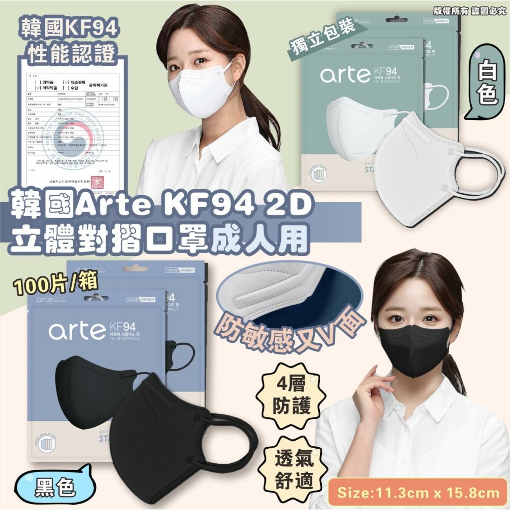 韓國Arte KF94 2D立體對摺口罩成人用 (100個獨立包裝 - 白色/黑色)