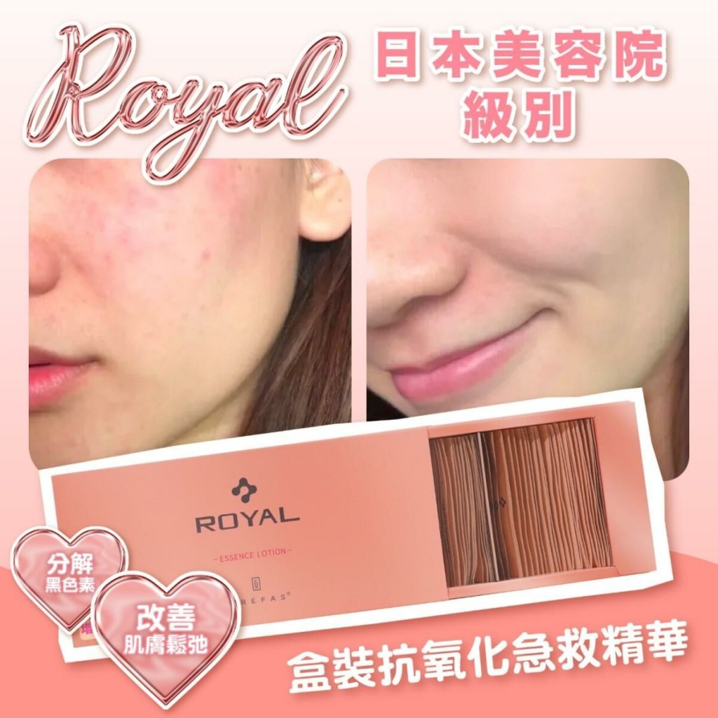 【Royal 盒裝臍帶血引導精華加強版🩸 .最新版外包裝更新升級為 GREFAS ROYAL】90小包(117ml)成份倍增效果再加強⬆️ ,由每包精華內的生胎盤精華含有45%增加到90%生胎盤精華🏆 !💁🏻♀️ 胎盤素有效增強肌底含水量,有助淡化皺紋,抗氧化效果出色,兼具平衡肌膚水油平衡,修復和軟化角質層,達至緊緻、逆齡、水嫩,讓你皮膚滑不溜手!90包獨立包裝,保持成份質素,貼心方便又衛生。💋 抗氧化急救神器✅ 美白亮膚,分解黑色素✅ 增強肌底自我含水量,有效預防肌膚乾燥✅ 醒膚、煥膚、活化肌膚、抗氧化✅ 超強抗衰老、抗皺、收細毛孔✅ 提升肌膚亮度,改善暗啞膚色,減少斑點形成✅ 幫助回復肌膚水油平衡,防止過度出油✅ 修復和軟化角質✅ 具有緊緻、逆齡功效,改善肌膚鬆弛,保持彈性✅ 恢復年輕水嫩肌膚,讓你容光煥發原產地:日本🎌 使用方法:1. 當作肌底液使用潔臉後作為肌底液,護膚的第一步用:潔臉後取出一包ROYAL,迅速塗抹於全臉並輕拍至吸收完全,使後續保養品更好吸收。2. 所有護膚完成之後的最後一步用基礎護膚後取出一包ROYAL,迅速塗抹於全臉並輕拍至吸收完全,此舉可把之前塗抹的護膚品滲入肌膚底層。