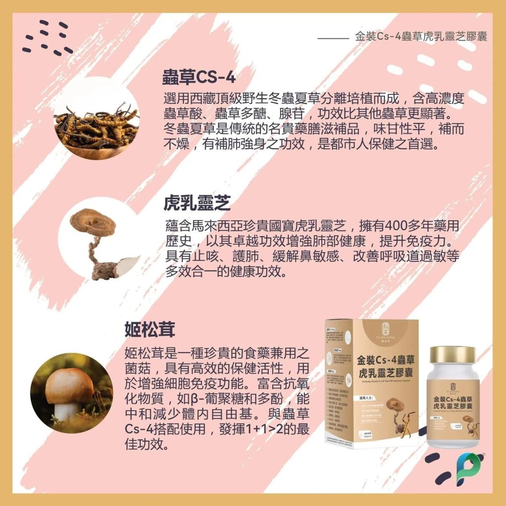 姬松茸是一種珍貴的食藥兼用菌菇,具有很高的保健活性,用於增強細胞免疫功能。富含抗氧化物質,如B-葡聚糖和多酚,能中和減少体内自由基。與蟲草Cs-4搭配使用,發揮1+1>2的健康效果。