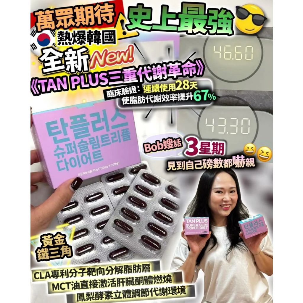 TAN Plus 一出Bob嫂都要Try Try 先 🤭🤭 3星期後feedback 減磅唔止佢自己嚇親自己 😱 我聽到都馬上想試 萬眾期待 史上最強 🔥🔥 熱爆韓國 全新《TAN PLUS三重代謝革命》 ‼️ 要為個body 尖叫一下 🥳 可以大聲同脂肪 Say Goodbye 👋