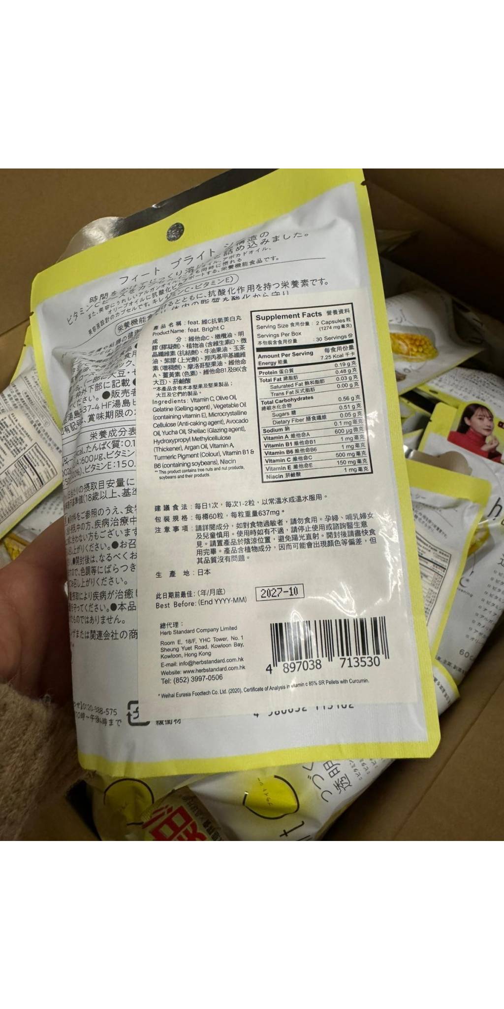 維他命C、橄欖油、明膠 (膠凝劑)、植物油 (含維生素E)、微晶纖維素 (抗結劑)、牛油果油、玉茶油、紫膠 (上光劑)、羥丙基甲基纖維素 (增稠劑)、摩洛哥堅果油、維他命A、薑黃素 (色素)、維他命B1及B6(含大豆)、菸鹼酸