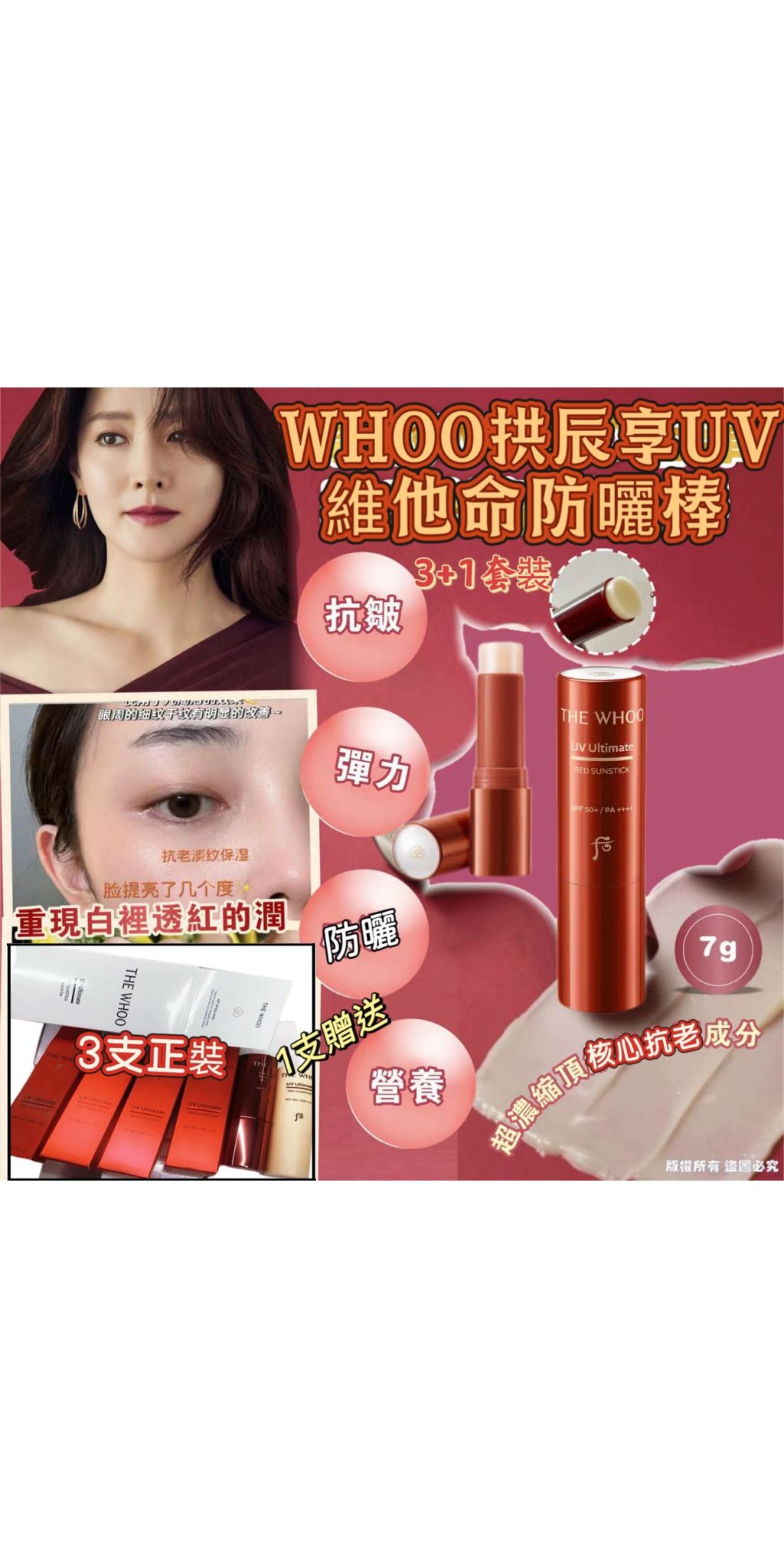 4月底到港,Whoo拱辰享UV維他命防曬棒SPF50+ PA++++ (3支7g正品+1支7g贈品)套裝