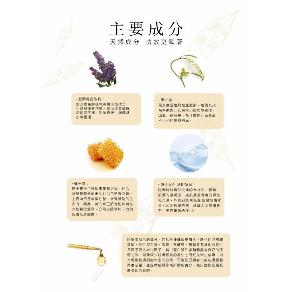 聖潔莓提取物:含有豐富的植物黃體天然成份、可以發揮其功效,進而改善緩解經前期不適、對抗衰老、胸部細小等困擾。